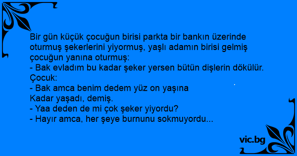 Bir gün küçük çocuğun birisi parkta bir bankın üzerinde oturmuş şekerlerini yiyormuş, yaşlı adamın birisi gelmiş çocuğun yanına oturmuş: