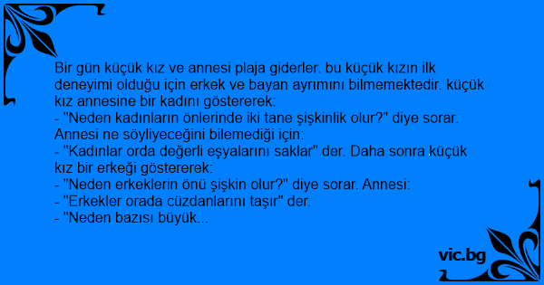 Bir gün küçük kız ve annesi plaja giderler. bu küçük kızın ilk deneyimi olduğu için erkek ve bayan ayrımını bilmemektedir. küçük kız annesine bir kadını göstererek: