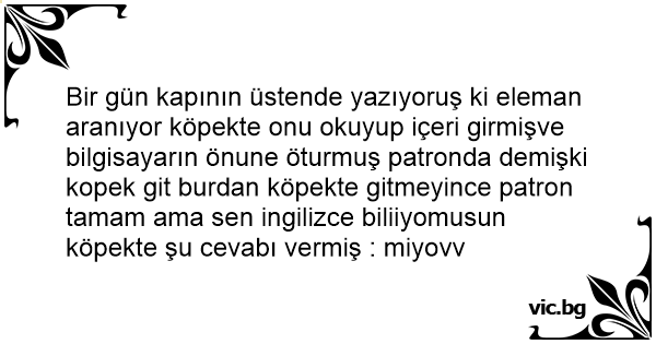 Bir gün kapının üstende yazıyoruş ki eleman aranıyor köpekte onu okuyup içeri girmişve bilgisayarın önune öturmuş patronda demişki kopek giт burdan köpekte gitmeyince patron tamam ama sen ingilizce biliiyomusun köpekte şu cevabı vermiş : miyovv