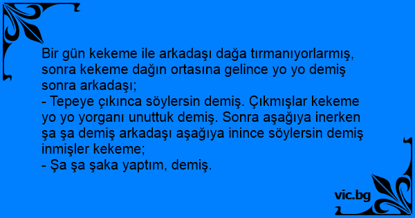 - Tepeye çıkınca söylersin demiş. Çıkmışlar kekeme yo yo yorganı unuttuk demiş. Sonra aşağıya inerken şa şa demiş arkadaşı aşağıya inince söylersin demiş inmişler kekeme;
