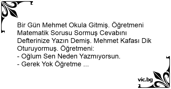Bir Gün Mehmet Okula Gitmiş. Öğretmeni Matematik Sorusu Sormuş Cevabını Defterinize Yazın Demiş. Mehmet Kafası Dik Oturuyormuş. Öğretmeni: