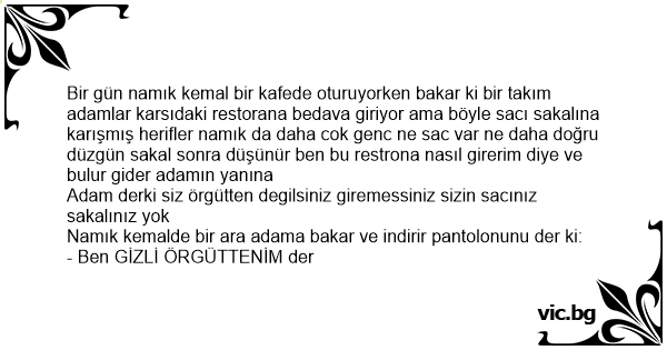 Bir gün namık kemal bir kafede oturuyorken bakar ki bir takım adamlar karsıdaki restorana bedava giriyor ama böyle sacı sakalına karışmış herifler namık da daha сок genc ne sac var ne daha doğru düzgün sakal sonra düşünür ben bu restrona nasıl girerim diye ve bulur gider adamın yanına