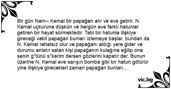 Bir gün Nam-ı Kemal bir papağan alır ve eve getirir. N. Kemal uçkuruna düşkün ve hergün eve farklı hatunlar getiren bir hayat sürmektedir. Tabi bir hatunla ilişkiye gireceği vakit papağan bunları izlemeye başlar, bundan da N. Kemal rahatsız olur ve papağanı aldığı yere gider ve durumu anlatır sатаn kişi papağanın kulağına eğilip ona senin g*tünü s*kerim dersen gözlerini kapatır der. Bunun üzerine N. Kemal eve sarışın bomba gibi bir hatun götürür yine ilişkiye girecekleri zaman papağan bunları izlemeye başlar. N. Kemel kalkar ve papağana senin g*tünü s*kerim der. Tabi papağan hemen gözlerini kapatır. Bunun üzerine kadına derki: sen bacaklarını ayır ben burdan masaya oradan sehpaya oradan kanepe ve oradanda senin üstüne atlıyacağım. O sıra papağan yine gözlerini açar. N. Kemal papağanın gözlerini kapaması için tekrar küfür eder. Papağan o zaman derki anamıda s*ksen bu pozisyonu kaçırmam.