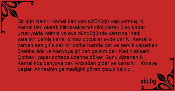 Bir gün Nam-ı Kemal kamyon şöfürlügü yapıyormuş N. Kemal tam olarak bilmesekte tahmini olarak 3 ay kadar uzun yolda kalmış ve eve dündüğünde karısına “hadi yatalım” demiş karısı olmaz çocuklar evde der N. Kemal o zaman sen giт sıcak bir corba hazırla der ve servis yaparken üzerine dök ve banyoya giт ben gelirim der. Kadın akşam Çorbayı yapar sofrada üzerine döker. Bunu öğrenen N. Kemal koş banyoya der. Ardından gider ve karısını .. Kmeye başlar. Annesinin gelmediğini gören çocuk kalkıp banyoya gider ve gördügü manzara karşısında korkup kardeşlerinin yanına koşar ve kardeşlerine derki aman oğlum üzerinize corba dökmeyin babam sizide .. Ker