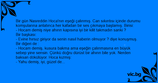 - Hocam demiş, kusura bakma ama eşeğin çalınmasına en büyük sebep yine sensin. Çünkü doğru dürüst bir ahırın bile yok. Nerden baksan dökülüyor. Hoca kızmış: