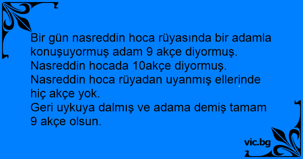 Bir gün nasreddin hoca rüyasında bir adamla konuşuyormuş adam 9 akçe diyormuş. Nasreddin hocada 10akçe diyormuş.