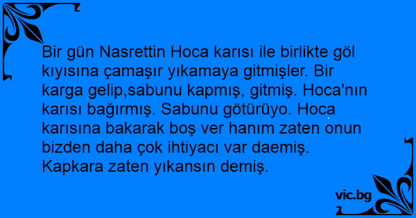 Bir gün Nasrettin Hoca karısı ile birlikte göl kıyısına çamaşır yıkamaya gitmişler. Bir karga gelip,sabunu kapmış, gitmiş. Hoca'nın karısı bağırmış. Sabunu götürüyo. Hoca karısına bakarak boş ver hanım zaten onun bizden daha çok ihtiyacı var daemiş. Kapkara zaten yıkansın demiş.