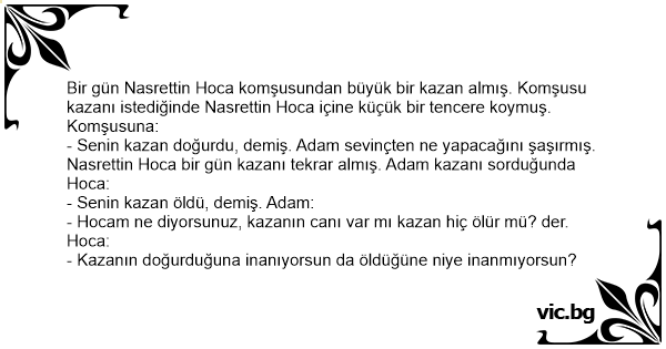 - Senin kazan doğurdu, demiş. Adam sevinçten ne yapacağını şaşırmış. Nasrettin Hoca bir gün kazanı tekrar almış. Adam kazanı sorduğunda Hoca: