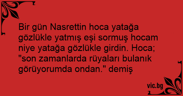 Bir gün Nasrettin hoca yatağa gözlükle yatmış eşi sormuş hocam niye yatağa gözlükle girdin. Hoca; "son zamanlarda rüyaları bulanık görüyorumda ondan." demiş