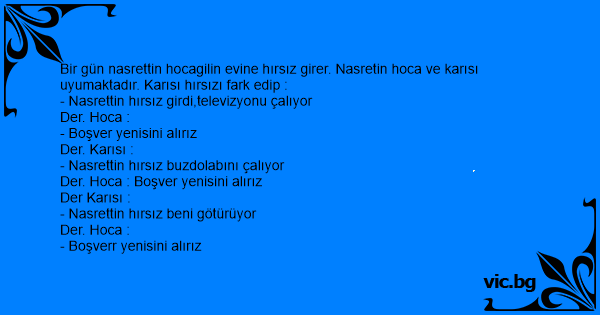 Bir gün nasrettin hocagilin evine hırsız girer. Nasretin hoca ve karısı uyumaktadır. Karısı hırsızı fark edip :