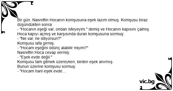 - "Hocanın eşeği var, ondan isteyeyim." demiş ve Hocanın kapısını çalmış.