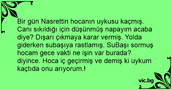Bir gün Nasrettin hocanın uykusu kaçmış. Canı sıkıldığı için düşünmüş napayım acaba diye? Dışarı çıkmaya karar vermiş. Yolda giderken subaşıya rastlamış. SuBaşı sormuş hocam gece vakti ne işin var burada? diyince. Hoca iç geçirmiş ve demiş ki uykum kaçtıda onu arıyorum.!