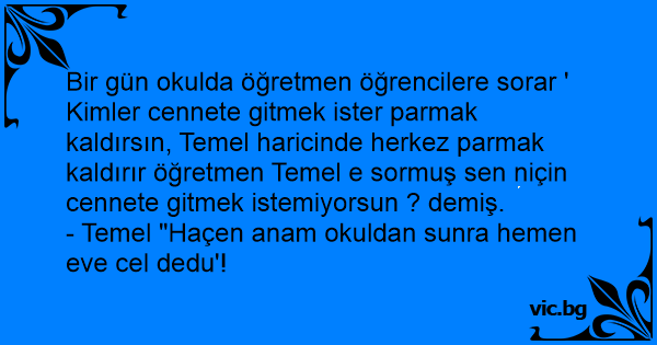Bir gün okulda öğretmen öğrencilere sorar ' Kimler cennete gitmek ister parmak kaldırsın, Temel haricinde herkez parmak kaldırır öğretmen Temel e sormuş sen niçin cennete gitmek istemiyorsun ? demiş.