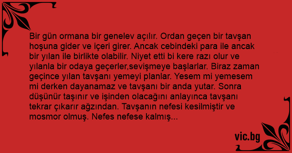 Bir gün ormana bir genelev açılır. Ordan geçen bir tavşan hoşuna gider ve içeri girer. Ancak cebindeki para ile ancak bir yılan ile birlikte olabilir. Niyet etti bi kere razı olur ve yılanla bir odaya geçerler,sevişmeye başlarlar. Biraz zaman geçince yılan tavşanı yemeyi planlar. Yesem mi yemesem mi derken dayanamaz ve tavşanı bir anda yutar. Sonra düşünür taşınır ve işinden olacağını anlayınca tavşanı tekrar çıkarır ağzından. Tavşanın nefesi kesilmiştir ve mosmor olmuş. Nefes nefese kalmış ve biraz kendine gelince yılan döner ve: *MINA KODUÄžUM NE BİÇİM AÄžZINA ALIYORSUN ÖYLE.