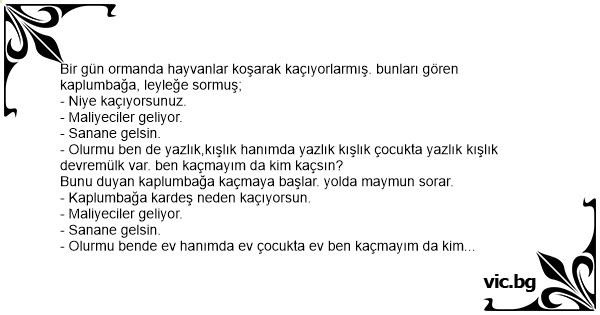 Bir gün ormanda hayvanlar koşarak kaçıyorlarmış. bunları gören kaplumbağa, leyleğe sormuş;