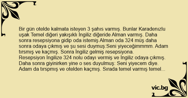 Bir gün otelde kalmata isteyen 3 şahıs varmış. Bunlar Karadenızlu uşak Temel diğeri yakışıklı İngiliz diğeride Alman varmış. Daha sonra resepsiyona gidip oda istemiş Alman oda 324 müş daha sonra odaya çıkmış ve şu sesi duymuş:Seni yiyeceğimmmm. Adam tırsmış ve kaçmış. Sonra İngiliz gelmiş resepsiyona.