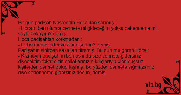 - Kızmayın padişahım ben aslında size cennete gidersiniz diyecektim fakat sizin cellatlarınızın kılıçlarıyla ölen suçsuz kişilerden cennet dolup taşmış. Bu yüzden cennete sığmazsınız diye cehenneme gidersiniz dedim, demiş.