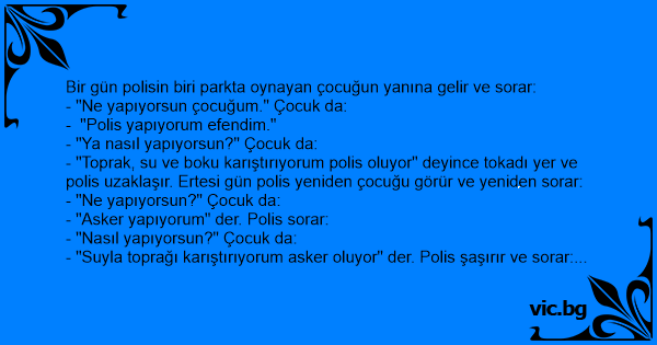 - "Toprak, su ve boku karıştırıyorum polis oluyor" deyince tokadı yer ve polis uzaklaşır. Ertesi gün polis yeniden çocuğu görür ve yeniden sorar: