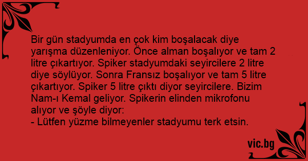 Bir gün stadyumda en çok kim boşalacak diye yarışma düzenleniyor. Önce alman boşalıyor ve tam 2 litre çıkartıyor. Spiker stadyumdaki seyircilere 2 litre diye söylüyor. Sonra Fransız boşalıyor ve tam 5 litre çıkartıyor. Spiker 5 litre çıktı diyor seyircilere. Bizim Nam-ı Kemal geliyor. Spikerin elinden mikrofonu alıyor ve şöyle diyor: