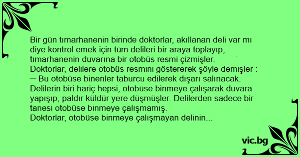 Bir gün tımarhanenin birinde doktorlar, akıllanan deli var mı diye kontrol emek için tüm delileri bir araya toplayıp, tımarhanenin duvarına bir otobüs resmi çizmişler.