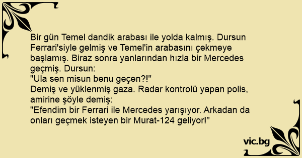 Bir gün Temel dandik arabası ile yolda kalmış. Dursun Ferrari'siyle gelmiş ve Temel'in arabasını çekmeye başlamış. Biraz sonra yanlarından hızla bir Mercedes geçmiş. Dursun: