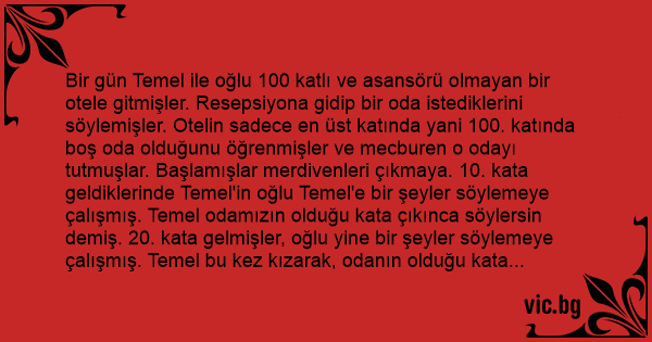 Bir gün Temel ile oğlu 100 katlı ve asansörü olmayan bir otele gitmişler. Resepsiyona gidip bir oda istediklerini söylemişler. Otelin sadece en üst katında yani 100. katında boş oda olduğunu öğrenmişler ve mecburen o odayı tutmuşlar. Başlamışlar merdivenleri çıkmaya. 10. kata geldiklerinde Temel'in oğlu Temel'e bir şeyler söylemeye çalışmış. Temel odamızın olduğu kata çıkınca söylersin demiş. 20. kata gelmişler, oğlu yine bir şeyler söylemeye çalışmış. Temel bu kez kızarak, odanın olduğu kata çıkınca söylersin demiş. Sonunda odalarının olduğu kata çıkmışlar. Temel oğluna "Heh şimdi söyle bakayım söylemek istediğini." demiş. Oğlu demesin mi "Baba, odanın anahtarlarını aşağıda unuttuk!"