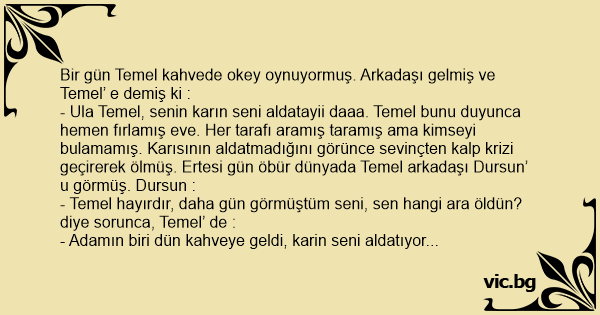 - Ula Temel, senin karın seni aldatayii daaa. Temel bunu duyunca hemen fırlamış eve. Her tarafı aramış taramış ama kimseyi bulamamış. Karısının aldatmadığını görünce sevinçten kalp krizi geçirerek ölmüş. Ertesi gün öbür dünyada Temel arkadaşı Dursun’ u görmüş. Dursun :