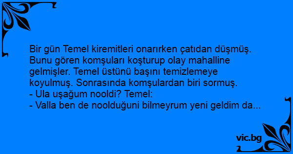 Bir gün Temel kiremitleri onarırken çatıdan düşmüş. Bunu gören komşuları koşturup olay mahalline gelmişler. Temel üstünü başını temizlemeye koyulmuş. Sonrasında komşulardan biri sormuş.