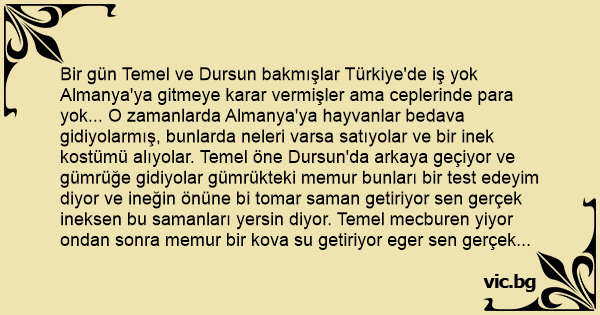 Bir gün Temel ve Dursun bakmışlar Türkiye'de iş yok Almanya'ya gitmeye karar vermişler ama ceplerinde para yok... O zamanlarda Almanya'ya hayvanlar bedava gidiyolarmış, bunlarda neleri varsa satıyolar ve bir inek kostümü alıyolar. Temel öne Dursun'da arkaya geçiyor ve gümrüğe gidiyolar gümrükteki memur bunları bir test edeyim diyor ve ineğin önüne bi tomar saman getiriyor sen gerçek ineksen bu samanları yersin diyor. Temel mecburen yiyor ondan sonra memur bir kova su getiriyor eger sen gerçek ineksen bunu içersin diyor ve Temel içiyor.. Memur bu sefer bi tomar taze ot getiriyo ve ineğin önüne koyuyor Temel mecburen yiyor... Artık Temel şişiyor ve bir lokma bir şey yiyemez hale geliyor.