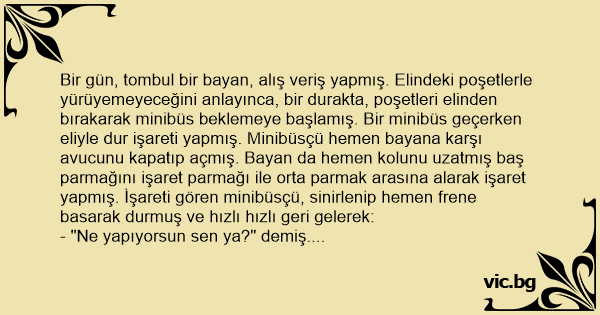 Bir gün, tombul bir bayan, alış veriş yapmış. Elindeki poşetlerle yürüyemeyeceğini anlayınca, bir durakta, poşetleri elinden bırakarak minibüs beklemeye başlamış. Bir minibüs geçerken eliyle dur işareti yapmış. Minibüsçü hemen bayana karşı avucunu kapatıp açmış. Bayan da hemen kolunu uzatmış baş parmağını işaret parmağı ile orta parmak arasına alarak işaret yapmış. İşareti gören minibüsçü, sinirlenip hemen frene basarak durmuş ve hızlı hızlı geri gelerek: