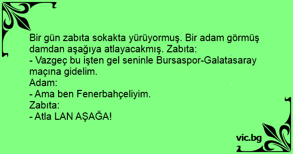 Bir gün zabıta sokakta yürüyormuş. Bir adam görmüş damdan aşağıya atlayacakmış. Zabıta: