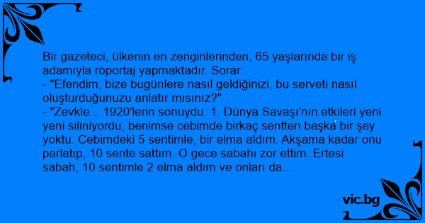 Bir gazeteci, ülkenin en zenginlerinden, 65 yaşlarında bir iş adamıyla röportaj yapmaktadır. Sorar: