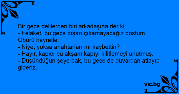 - Düşündüğün şeye bak, bu gece de duvardan atlayıp gideriz.