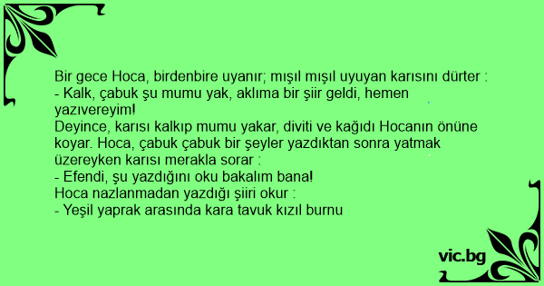Deyince, karısı kalkıp mumu yakar, diviti ve kağıdı Hocanın önüne koyar. Hoca, çabuk çabuk bir şeyler yazdıktan sonra yatmak üzereyken karısı merakla sorar :