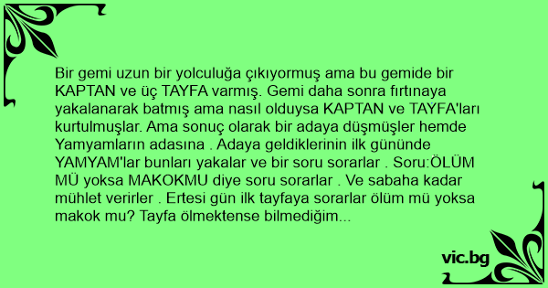 Bir gemi uzun bir yolculuğa çıkıyormuş ama bu gemide bir KAPTAN ve üç TAYFA varmış. Gemi daha sonra fırtınaya yakalanarak batmış ama nasıl olduysa KAPTAN ve TAYFA'ları kurtulmuşlar. Ama sonuç olarak bir adaya düşmüşler hemde Yamyamların adasına . Adaya geldiklerinin ilk gününde YAMYAM'lar bunları yakalar ve bir soru sorarlar . Soru:ÖLÜM MÜ yoksa MAKOKMU diye soru sorarlar . Ve sabaha kadar mühlet verirler . Ertesi gün ilk tayfaya sorarlar ölüm mü yoksa makok mu? Tayfa ölmektense bilmediğim şeyi olurum daha iyi der ve makok diye cevap verir. Ardından adamı bir kere s*kerler ve bırakırlar. Diğer tayfaya da aynı soruyu sorarlar ve aynı cevabı alırlar ve onu da yaptıktan sonra serbest bırakırlar. Son tayfada aynı olayları yaşar ve serbest bırakılır. Sonunda KAPTANA gelmiştir KAPTAN çevresindekilere nutuk atarcasına ayağa kalkar ve "Ben bir KAPTAN olarak gururlu ve şerefli biri olarak yaşadım ve yine bu şerefimi hayatım pahasına da olsa vermem, ben ölümü tercih ediyorum der.