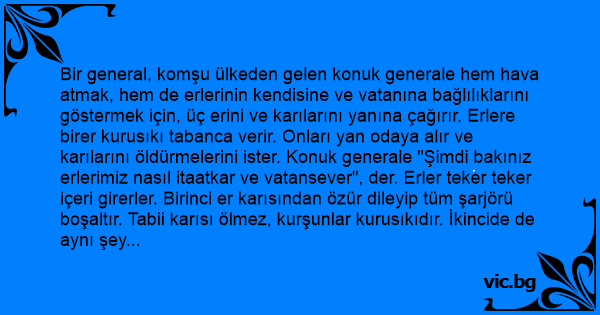 Bir general, komşu ülkeden gelen konuk generale hem hava atmak, hem de erlerinin kendisine ve vatanına bağlılıklarını göstermek için, üç erini ve karılarını yanına çağırır. Erlere birer kurusıkı tabanca verir. Onları yan odaya alır ve karılarını öldürmelerini ister. Konuk generale "Şimdi bakınız erlerimiz nasıl itaatkar ve vatansever", der. Erler teker teker içeri girerler. Birinci er karısından özür dileyip tüm şarjörü boşaltır. Tabii karısı ölmez, kurşunlar kurusıkıdır. İkincide de aynı şey olur. Generalin gözleri yaşarmıştır. En son giren erin ardından, iki general kurşun seslerini dinlerken, "dan dan dan dan dan dan... şangırrrr", diye bir ses duyarlar. İşini bitirip çıkan ere merakla sorarlar, "neydi o şangırrr sesi?" diye. Er yanıtlar: