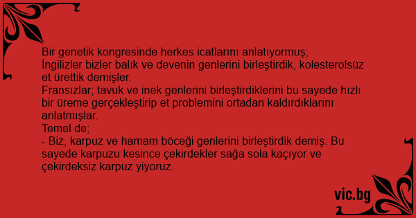 - Biz, karpuz ve hamam böceği genlerini birleştirdik demiş. Bu sayede karpuzu kesince çekirdekler sağa sola kaçıyor ve çekirdeksiz karpuz yiyoruz.