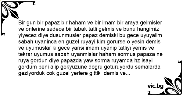 Bir gun bir papaz bir haham ve bir imam bir araya gelmisler ve onlerine sadece bir tabak tatli gelmis ve bunu hangimiz yiyecez diye dusunmusler papaz demiski bu gece uyuyalim sabah uyaninca en guzel ruyayi kim gorurse o yesin demis ve uyumuslar ki gece yarisi imam uyanip tatliyi yemis ve tekrar uyumus sabah uyanmislar haham sormus papaza ne ruya gordun diye papazda yaw sorma ruyamda hz isayi gordum beni alip gokyuzune dogru goturuyordu semalarda geziyorduk сок guzel yerlere gittik demis ve haham guzel bir ruya gormussun demis papazda evet sen ne gordun haham demis ki hahamda yaw sorma bende gece ruyamda hz musayi gordum beni aliyordu goklere guzel yerlere goturuyordu bulutlarin ustunde geziyorduk harika yerlere gittik demis papaz sende guzel ruya gormussun demis bunun uzerine ikisi imama donmus imam sen ne gordun demisler imamda yaw bir baktimki biriniz hz isayla biriniz hz musayla gittiniz tatli ziyan olmasin diye bende yedim demis )))