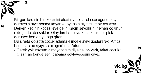 - O zaman bende seni babama soyleyecegim diye tam disari cikarken adam almak zorunda kalir. Aradan 5 dakika gecmeden cocuk;