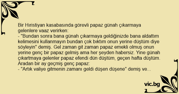 - "Bundan sonra bana günah çıkarmaya geldiğinizde bana aldattım kelimesini kullanmayın bundan çok bıktım onun yerine düştüm diye söyleyin" demiş. Gel zaman giт zaman papaz emekli olmuş onun yerine genç bir papaz gelmiş ama her şeyden habersiz. Yine günah çıkartmaya gelenler papaz efendi dün düştüm, geçen hafta düştüm. Aradan bir ay geçmiş genç papaz: