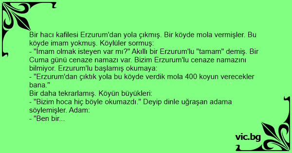 - "İmam olmak isteyen var mı?" Akıllı bir Erzurum'lu "tamam" demiş. Bir Cuma günü cenaze namazı var. Bizim Erzurum'lu cenaze namazını bilmiyor. Erzurum'lu başlamış okumaya: