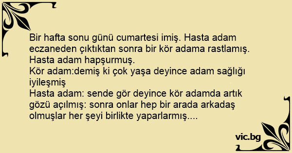 Bir hafta sonu günü cumartesi imiş. Hasta adam eczaneden çıktıktan sonra bir kör adama rastlamış. Hasta adam hapşurmuş.