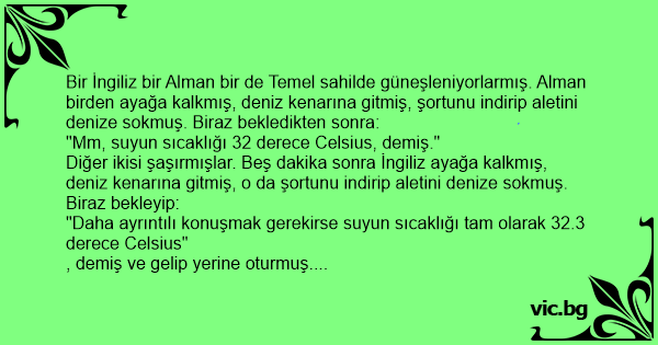 Bir İngiliz bir Alman bir de Temel sahilde güneşleniyorlarmış. Alman birden ayağa kalkmış, deniz kenarına gitmiş, şortunu indirip aletini denize sokmuş. Biraz bekledikten sonra: