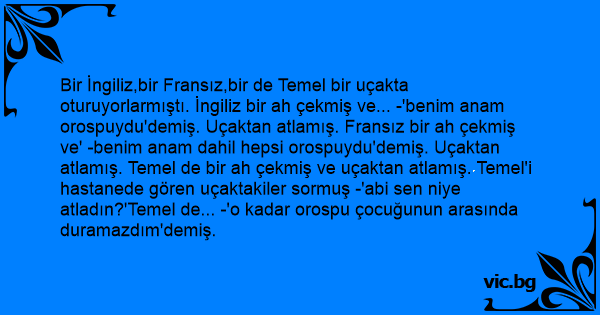 Bir İngiliz,bir Fransız,bir de Temel bir uçakta oturuyorlarmıştı. İngiliz bir ah çekmiş ve... -'benim anam orospuydu'demiş. Uçaktan atlamış. Fransız bir ah çekmiş ve' -benim anam dahil hepsi orospuydu'demiş. Uçaktan atlamış. Temel de bir ah çekmiş ve uçaktan atlamış. Temel'i hastanede gören uçaktakiler sormuş -'abi sen niye atladın?'Temel de... -'o kadar orospu çocuğunun arasında duramazdım'demiş.