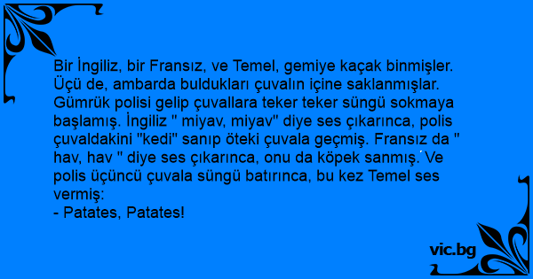 Bir İngiliz, bir Fransız, ve Temel, gemiye kaçak binmişler. Üçü de, ambarda buldukları çuvalın içine saklanmışlar. Gümrük polisi gelip çuvallara teker teker süngü sokmaya başlamış. İngiliz " miyav, miyav" diye ses çıkarınca, polis çuvaldakini "kedi" sanıp öteki çuvala geçmiş. Fransız da " hav, hav " diye ses çıkarınca, onu da köpek sanmış. Ve polis üçüncü çuvala süngü batırınca, bu kez Temel ses vermiş: