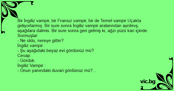 Bir İngiliz vampir, bir Fransız vampir, bir de Temel vampir Uçakta gidiyorlarmış. Bir sure sonra İngiliz vampir aralarından ayrılmış, aşağılara dalmis. Bir sure sonra geri gelmiş ki, ağzı yüzü kan içinde.