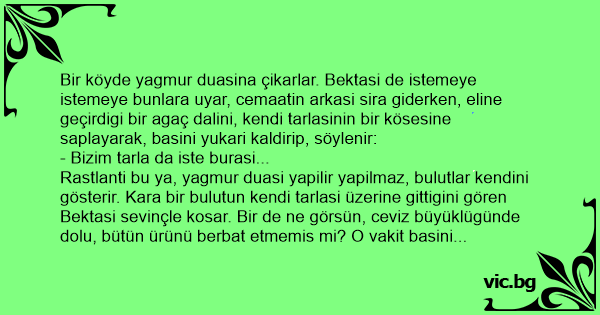 Bir köyde yagmur duasina çikarlar. Bektasi de istemeye istemeye bunlara uyar, cemaatin arkasi sira giderken, eline geçirdigi bir agaç dalini, kendi tarlasinin bir kösesine saplayarak, basini yukari kaldirip, söylenir: