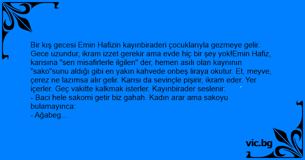 Gece uzundur, ikram izzet gerekir ama evde hiç bir şey yok!Emin Hafiz, karısına "sen misafirlerle ilgilen" der, hemen asılı olan kaynının "sako"sunu aldığı gibi en yakın kahvede onbeş liraya okutur. Et, meyve, çerez ne lazımsa alır gelir. Karısı da sevinçle pişirir, ikram eder. Yer içerler. Geç vakitte kalkmak isterler. Kayınbirader seslenir: