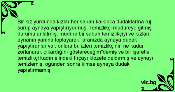 Bir kız yurdunda kızlar her sabah kalkınca dudaklarına ruj sürüp aynaya yapıştırıyormuş. Temizlikçi müdüreye gitmiş durumu anlatmış. müdüre bir sabah temizlikçiyi ve kızları aynanın yanına toplayarak "aranızda aynaya dudak yapıştıranlar var. onlara bu izleri temizlikçinin ne kadar zorlanarak çıkardığını göstereceğim"demiş ve bir işaretle temizlikçi kadın elindeki fırçayı klozete daldırmış ve aynayı temizlemiş. ogünden sonra kimse aynaya dudak yapıştırmamış