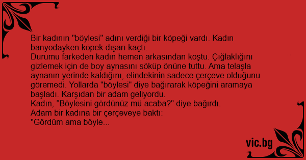 Durumu farkeden kadın hemen arkasından koştu. Çığlaklığını gizlemek için de boy aynasını söküp önüne tuttu. Ama telaşla aynanın yerinde kaldığını, elindekinin sadece çerçeve olduğunu göremedi. Yollarda "böylesi" diye bağırarak köpeğini aramaya başladı. Karşıdan bir adam geliyordu.